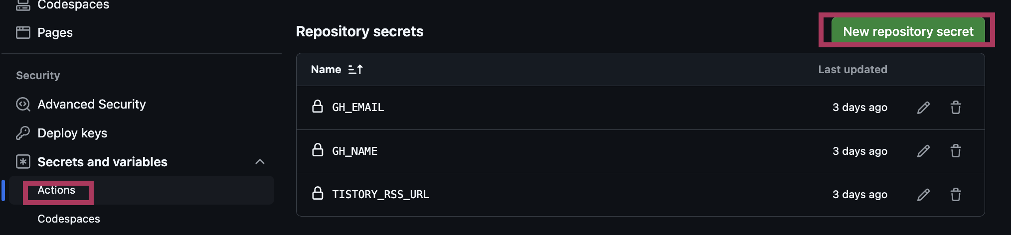 - TISTORY_RSS_URL (시크릿에서 불러옴) - 저장소 클론
